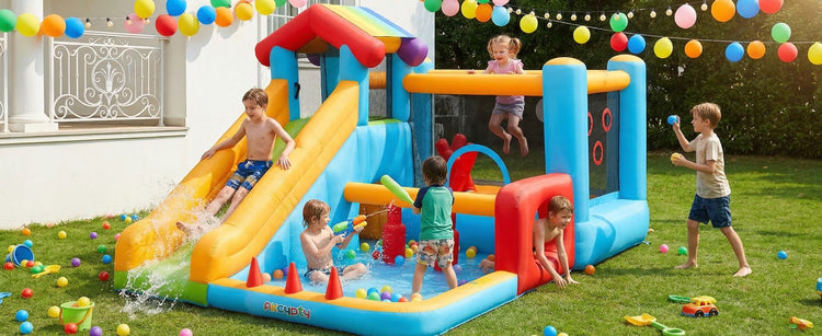 🏰【Inflatable Obstacle Bounce House】This bouncy castle features dual slides for sliding games, a huge bouncing area, an arch barrier and a built-in basketball hoop. The large bouncy house encourages children to enjoy playtime together. Let kids get exercise and have fun with every jump...
